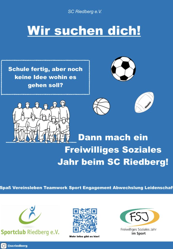 Der SC Riedberg bietet jungen, sportbegeisterten Menschen die Möglichkeit eines bezahlten freiwilligen sozialen Jahres an. Hierbei bekommst du Einblicke in viele verschiedene Aufgabenbereiche des Vereinslebens und kannst am Spielfeldrand u.a. unsere Rugby, Basketball und Fußball-Sparte unterstützen! Letzten September hat Marc T. bei uns als FSJler angefangen und wird, so wie vorherige FSJler auch, nach seinem freiwilligen Jahr bei uns weiterarbeiten.